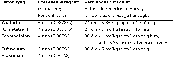 Mind az etetéses, mind a véralvadásos vizsgálat során meghatározásra kerül az a diszkrimináns rágcsálóirtószer dózis, amely az érzékeny rágcsáló populáció 99 %-ára végzetesen hat. Az etetéses vizsgálat meghatározott napig tart, míg a véralvadás vizsgálatnál a diszkrimináns dózis úgy kerül megállapításra, hogy a különböző dózis hatására fellépő vérzékenységet vizsgálja.