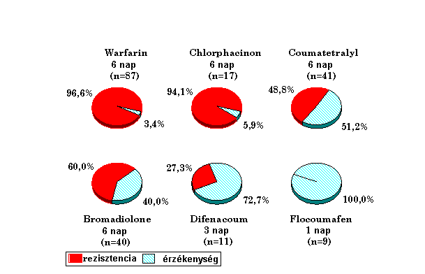 A vizsgálat azt mutatja, hogy komoly problémák merülnek fel a warfarin, a klorofacinon, a kumaetralil és a bromadiolon esetében. A difenakum esetében jelzésértékű, hogy a rezisztenciára utaló jelek már mutatkoznak, különösen ott, ahol az elfogadás és a csalétek felvétel gyengébb.